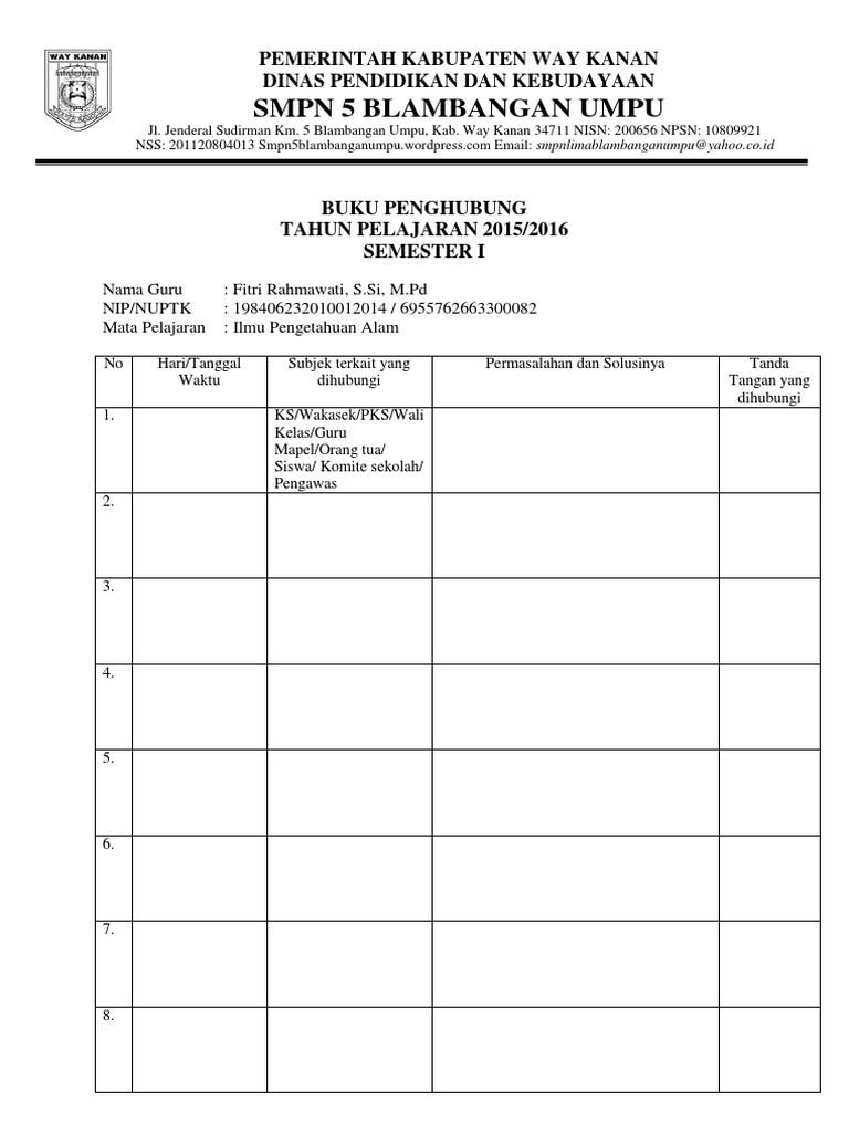 Ketua program keahlian teknik taknik audio video 7. Pengertian buku penghubung adalah buku yang dibuat dalam sebuah kerangka niat untuk membangun komunikasi yang efektif antara orang tua dan sekolah. 3.1 kata penghubung antara paragraf. Buku administrasi bk penghubung catatan kasus dan penyelesainnya mts. Wakil kepala sekolah kesiswaan 6. Siswa untuk di ketahui guru, pada catatan orang tua setiap. Download buku penghubung paud tk tpa kober. Jika berminat dengan buku penghubung ini, anda bisa mendownload contoh / format buku penghubung wali kelas dan orang tua yang kami share didownload buku penghubung, format buku penghubung paud,buku penghubung tk,cara mengisi buku penghubung,contoh pengisian buku penghubung,pengertian buku penghubung.contoh buku penghubung bk.buku penghubung anak usia dini Contoh atau format buku penghubung terlihat pada gambar berikut. Diharapkan dengan contoh format buku penghubung orang tua siswa dengan wali/ guru kelas ini dapat membatu anda guru kelas maupaun wali kelas dalam mengelolan kelas dan kebutuhan administrasi anda. Kritik dan saran sangat saya harapkan demi kemajuan blog ini kedepannya. Buku penghubung pada umumnya berisi data yang disajikan dalam bentuk tabel yang memuat tentang keterangan: Mengingat kesibukan orang tua yang tinggi merupakan kendala bagi pihak sekolah untuk menyampaikan informasi tentang perkembangan anak di sekolah.
