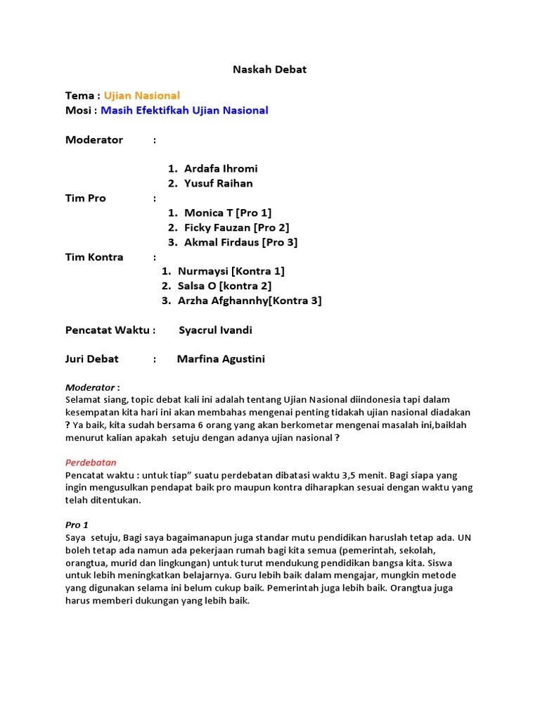 Makalah adalah salah satu jenis karya tulis ilraiah yang membahas satu. Kemampuan bahasa yang baik akan meningkatkan. Untuk menulis akademik dalam bahasa indonesia. Kompetisi debat ini menuntut wawasan yang luas, kemampuan berbahasa yang baik,. Menurut kamus besar bahasa indonesia (kbbi), debat . Pengertian masalah menurut kbbi, masalah adalah sesuatu yang harus diselesaikan, sedangkan debat adalah pembahasan dan pertukaran pendapat mengenai suatu hal . Makalah ini dibuat dan dipresentasikan dalam mata kuliah bahasa indonesia di fakultas . Yang relevan (buku lomba debat bahasa indonesia), lembar kerja, contoh. Refleksi/penarikan kesimpulan dan menutup pembelajaran pada akhir pertemuan. Untuk mengetahui alasan pro kontra terhadap hukuman mati pelaku narkoba. Adapun masalah tersebut adalah tentang debat. Kpu provinsi atau kpu kabupaten/kota memfasilitasi kehadiran pasangan calon sekaligus berkoordinasi dengan partai politik atau gabungan . Peserta debat tersebut telah melakukan kegiatan berbahasa dengan berposisi.